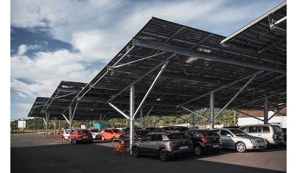 Ombrières photovoltaïques pour parking, monopentes et bipentes, avec ou sans options. Service clé en main : du bureau d'étude à la maintenance des services.